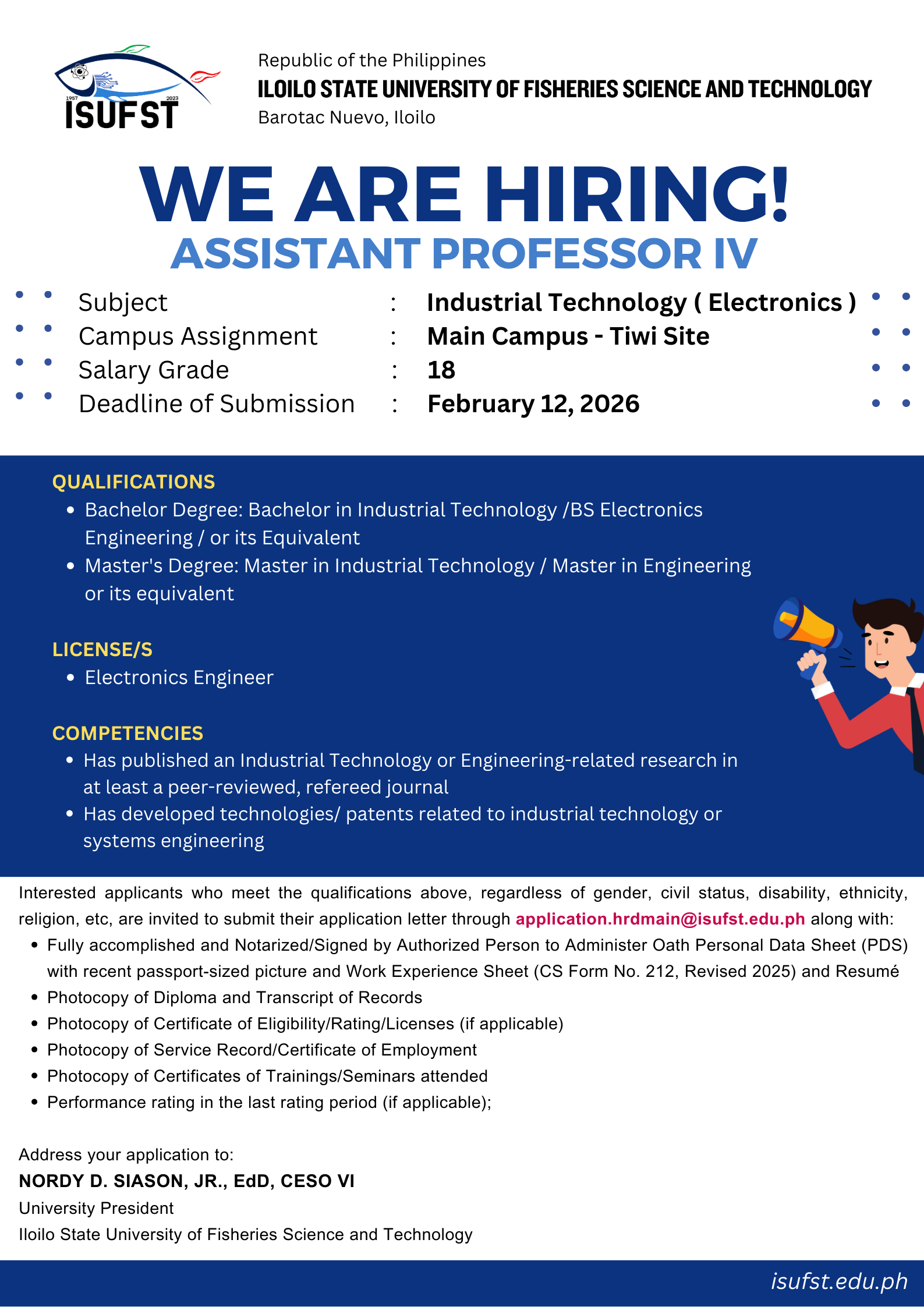 | Assistant Professor IV | Industrial Tech. (Electronics) | 02-02-2026 | 02-12-2026 | Main Campus – Tiwi Site | View |