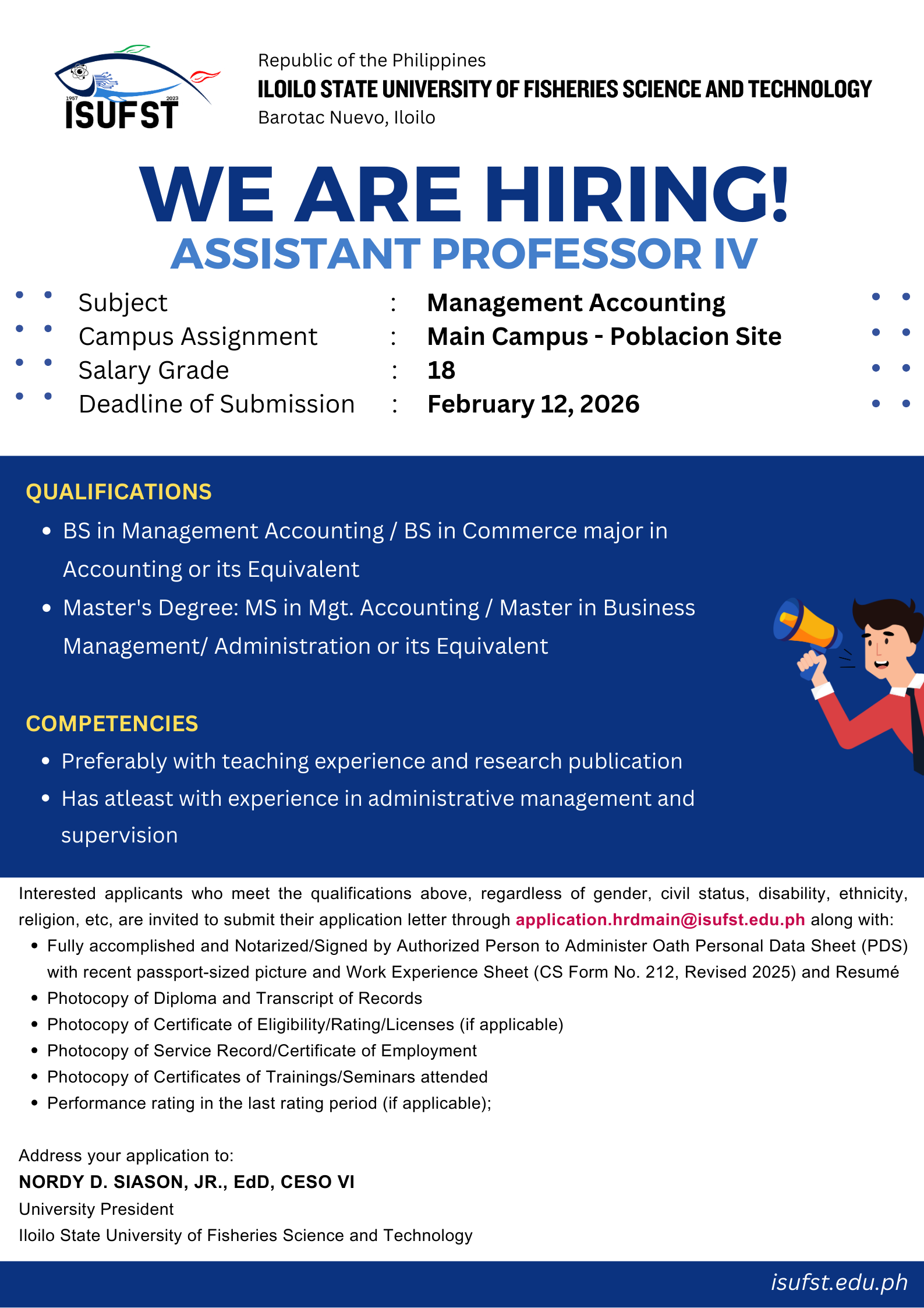 | Assistant Professor IV | Management Accounting | 02-02-2026 | 02-12-2026 | Main Campus – Poblacion Site | View |