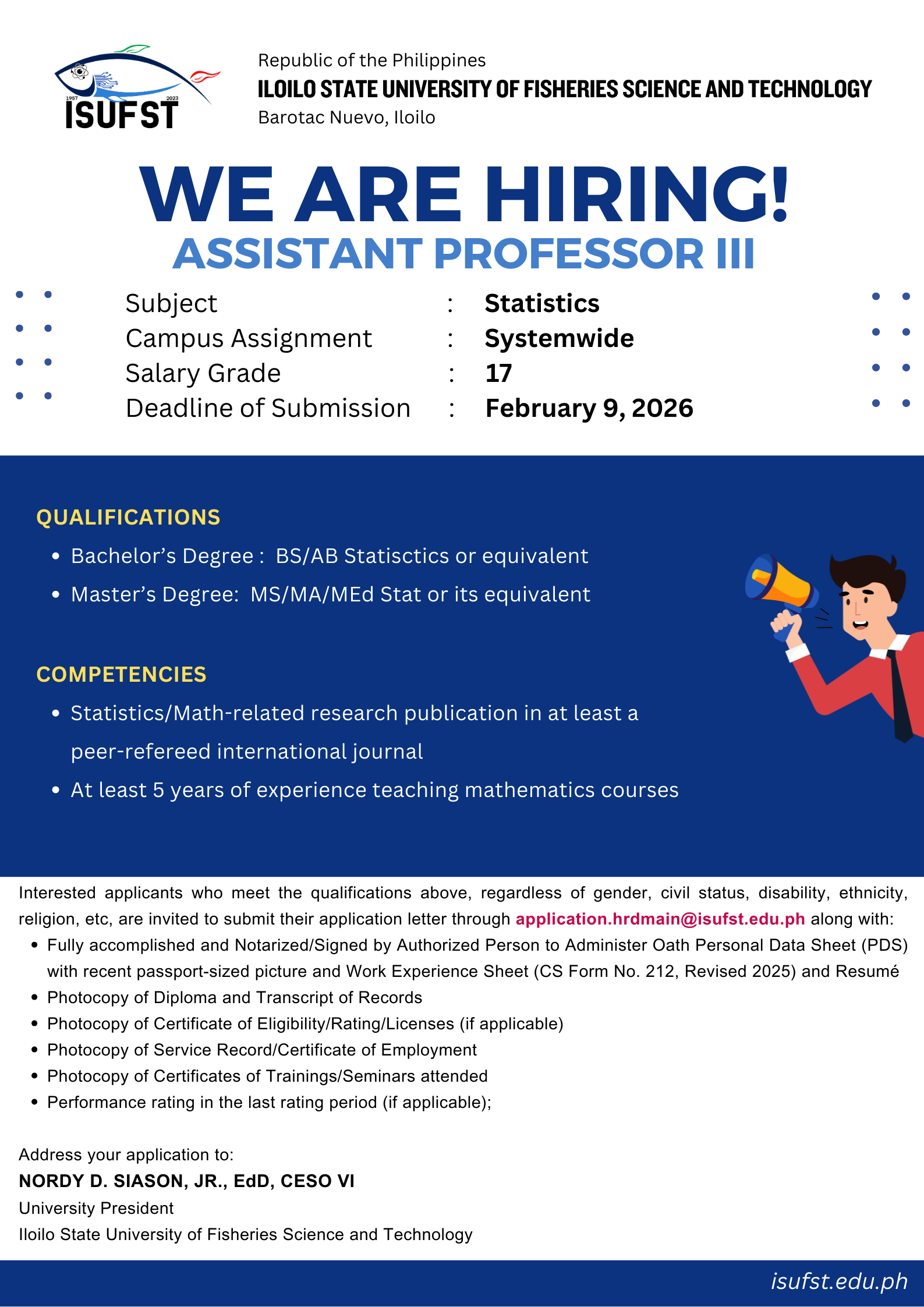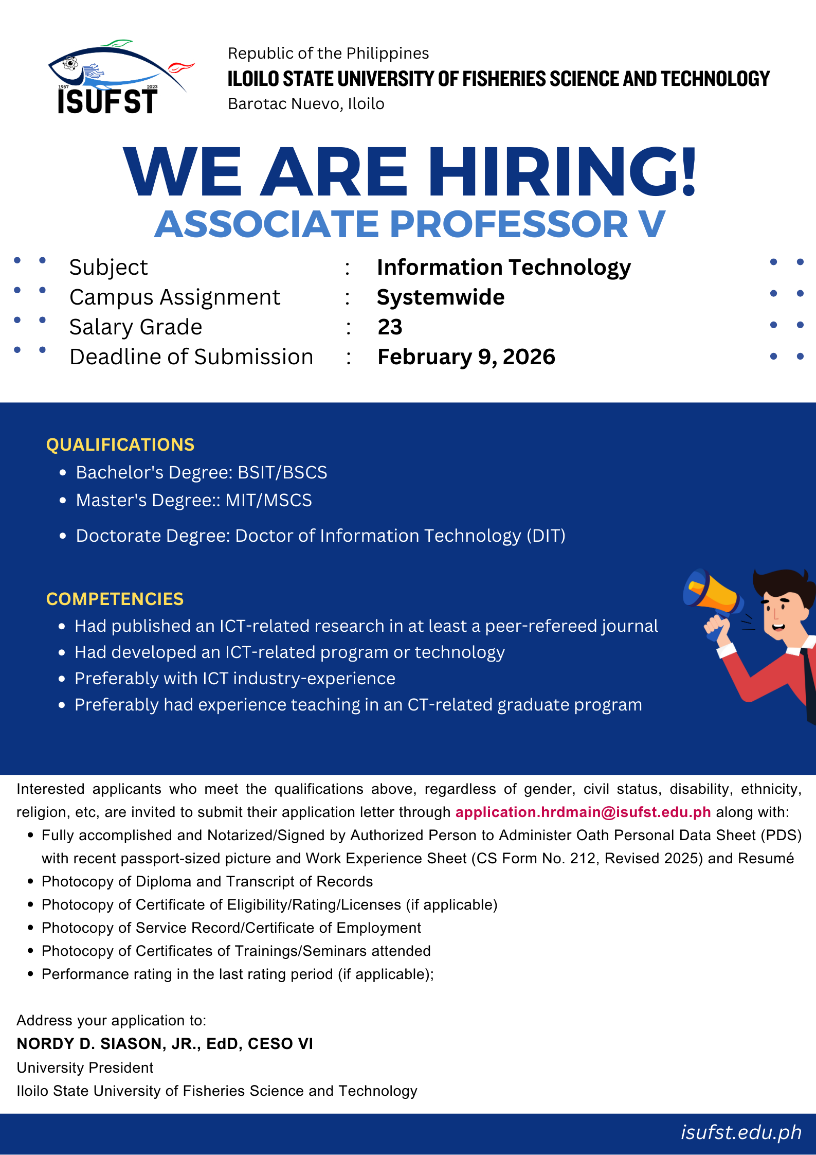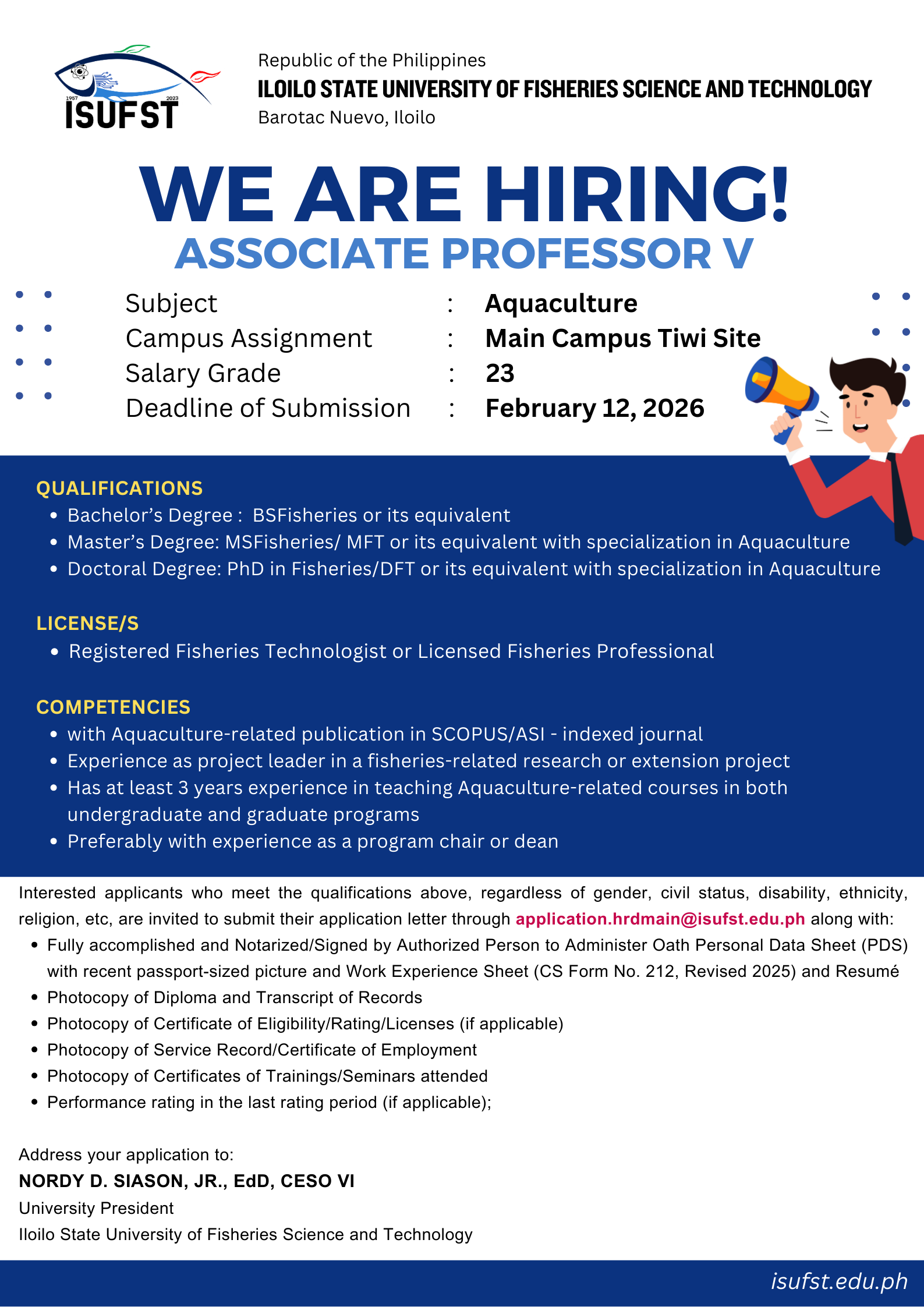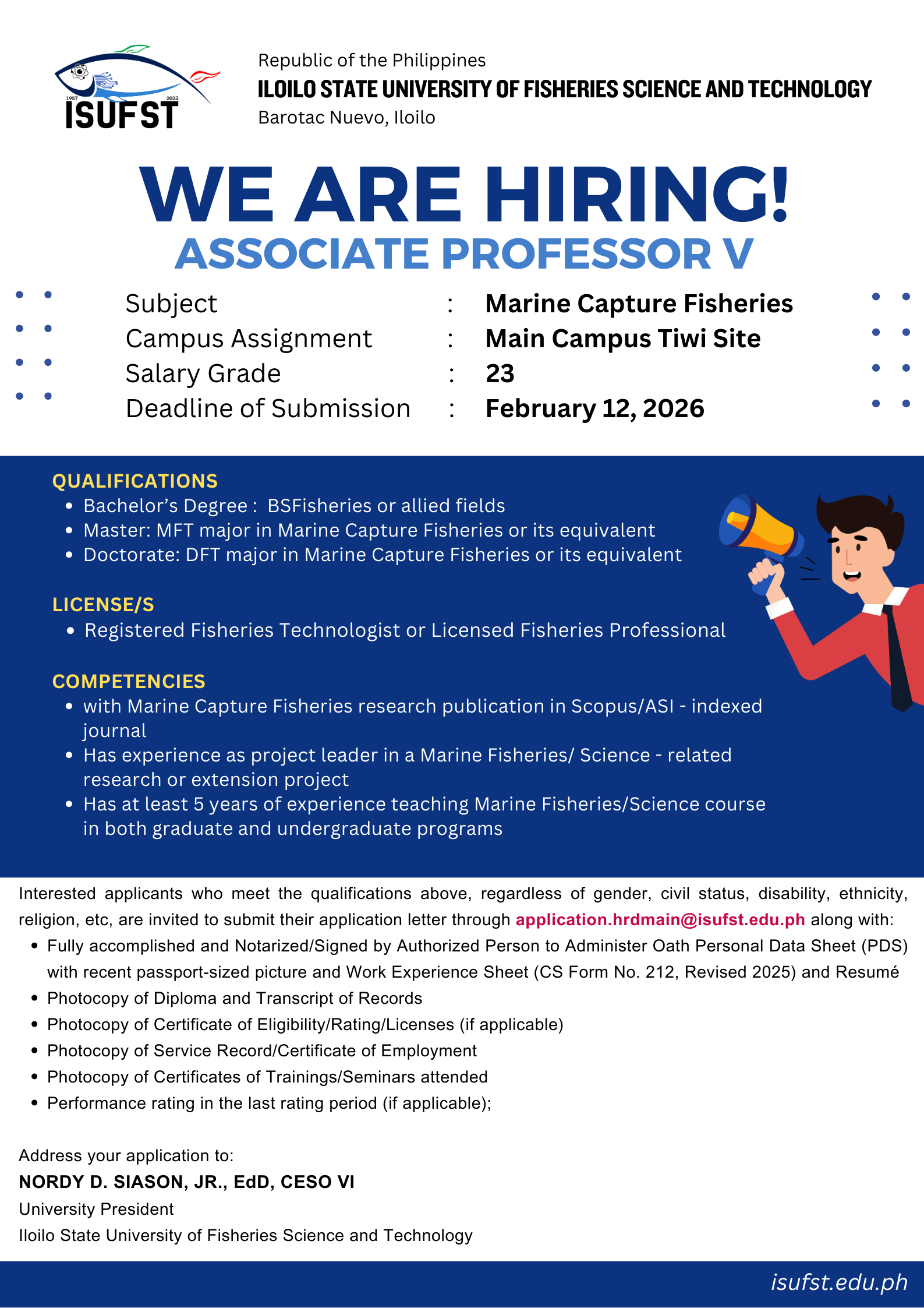 | Associate Professor V | Marine Capture Fisheries | 02-02-2026 | 02-12-2026 | Main Campus – Tiwi Site | View |